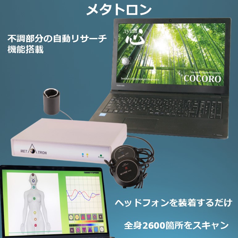 体内の周波数をスキャンすることで健康状態を測定する機器です。五臓六腑に関わる器官をリサーチします。また、ご自身がお悩みの症状がある部分を選択してリサーチします。不調だった部位の周波数は調整できます。また、ご自身の身体に合う食べ物やパワーストーンも分かります。他にも体内の重金属のバランスや生息している微生物なども表記されます。