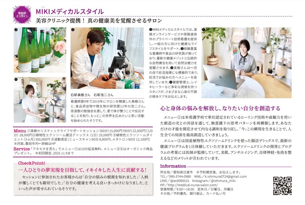 アネモネ11月号に掲載されました。 2025 4/09 セミナー 2024年11月7日2025年4月9日 心と身体を整える看護師のサロン「MIKIメディカルスタイル」が、anemone(アネモネ)2024年11月号に掲載されました。 セミナー よかったらシェアしてね! URLをコピーしました! URLをコピーしました! CREA12月号に掲載されました。 関連記事 己書講座 アースマルシェ 第3回宇宙評議会開催 生酵素工場見学バスツアー 無料動画 食品の選び方講座 CREA12月号に掲載されました。