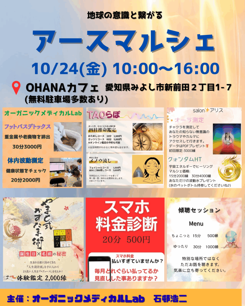 アースマルシェ 2025 10/11 セミナー 2025年10月11日 10/24(金)10:00~16:00 会場:OHANAカフェ 愛知県みよし市新前田2丁目1−7 ※駐車場多数あり セミナー よかったらシェアしてね! URLをコピーしました! URLをコピーしました! 第3回宇宙評議会開催 にっしん子育てサロン 関連記事 己書講座 第3回宇宙評議会開催 生酵素工場見学バスツアー 無料動画 食品の選び方講座 CREA12月号に掲載されました。 アネモネ11月号に掲載されました。 コメント コメントする コメントをキャンセルコメント ※ 名前 ※ メール ※ サイト 次回のコメントで使用するためブラウザーに自分の名前、メールアドレス、サイトを保存する。