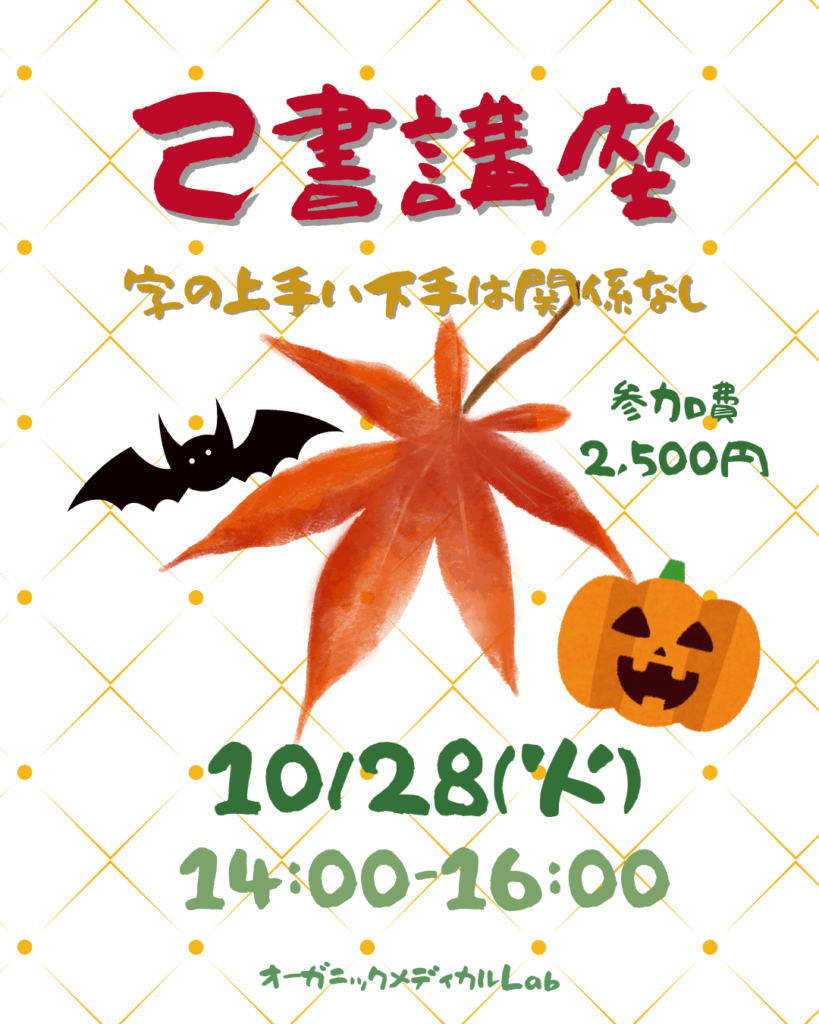 己書講座 2025 10/11 セミナー 2025年10月11日 10/28(火)14:00~16:00 会場:オーガニックメディカルLab 参加費:2500円(希望者は筆ペン2本を1000円で購入) 申込方法:下記のお申込みからご連絡下さい お申込み・お問合せはこちら セミナー よかったらシェアしてね! URLをコピーしました! URLをコピーしました! にっしん子育てサロン 関連記事 アースマルシェ 第3回宇宙評議会開催 生酵素工場見学バスツアー 無料動画 食品の選び方講座 CREA12月号に掲載されました。 アネモネ11月号に掲載されました。 コメント コメントする コメントをキャンセルコメント ※ 名前 ※ メール ※ サイト 次回のコメントで使用するためブラウザーに自分の名前、メールアドレス、サイトを保存する。