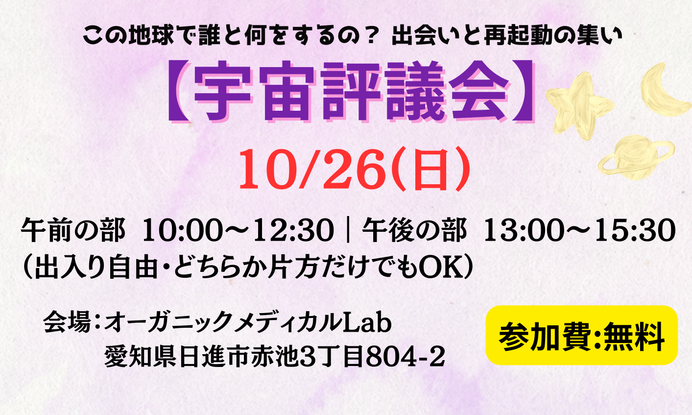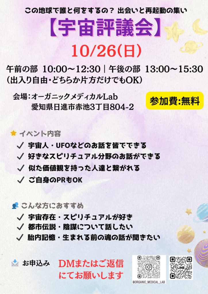 第3回宇宙評議会開催 2025 10/11 イベント セミナー 2025年10月11日 10/26(日) 午前の部:10:00~12:30、午後の部:13:00~15:30 会場:オーガニックメディカルLab 参加費:無料 申込:午前の部、午後の部、両方参加を下記のお問い合わせからご連絡下さい お申込み・お問合せはこちら イベント セミナー よかったらシェアしてね! URLをコピーしました! URLをコピーしました! 生酵素工場見学バスツアー アースマルシェ 関連記事 己書講座 アースマルシェ 生酵素工場見学バスツアー 無料動画 食品の選び方講座 CREA12月号に掲載されました。 アネモネ11月号に掲載されました。 コメント コメントする コメントをキャンセルコメント ※ 名前 ※ メール ※ サイト 次回のコメントで使用するためブラウザーに自分の名前、メールアドレス、サイトを保存する。