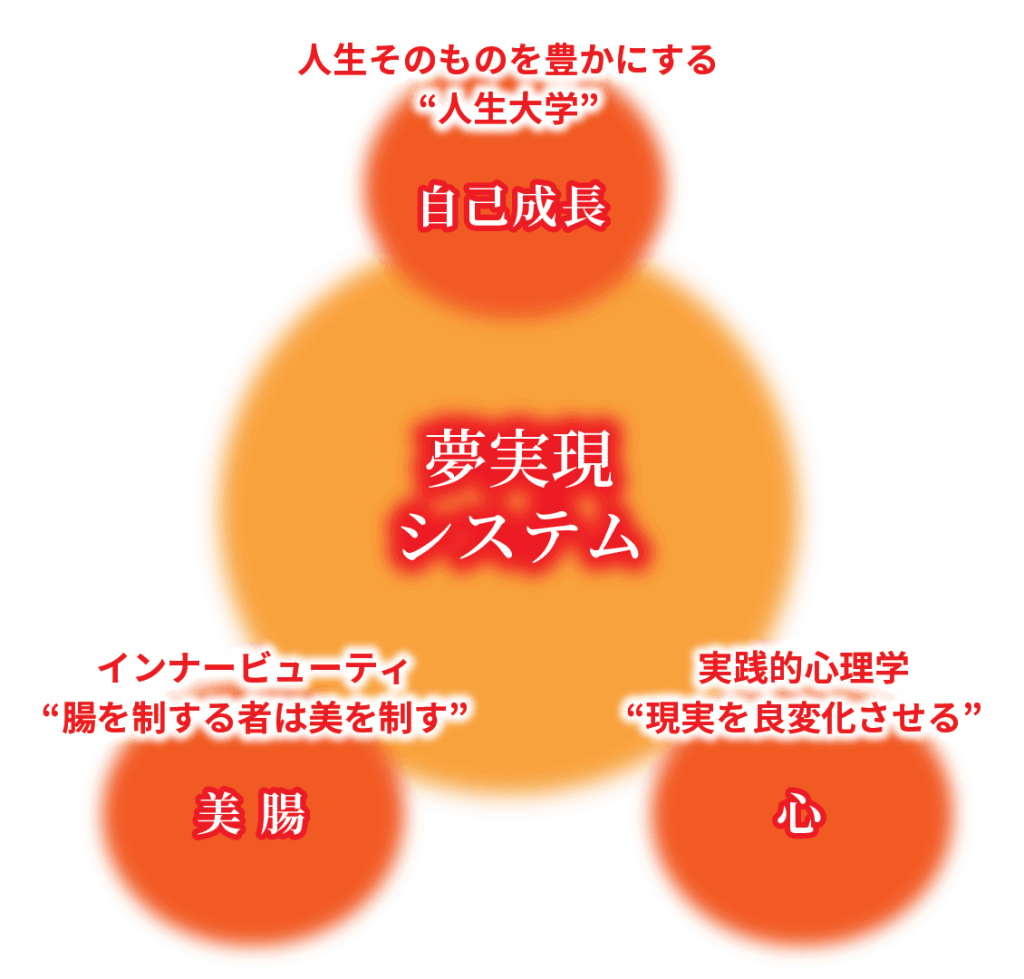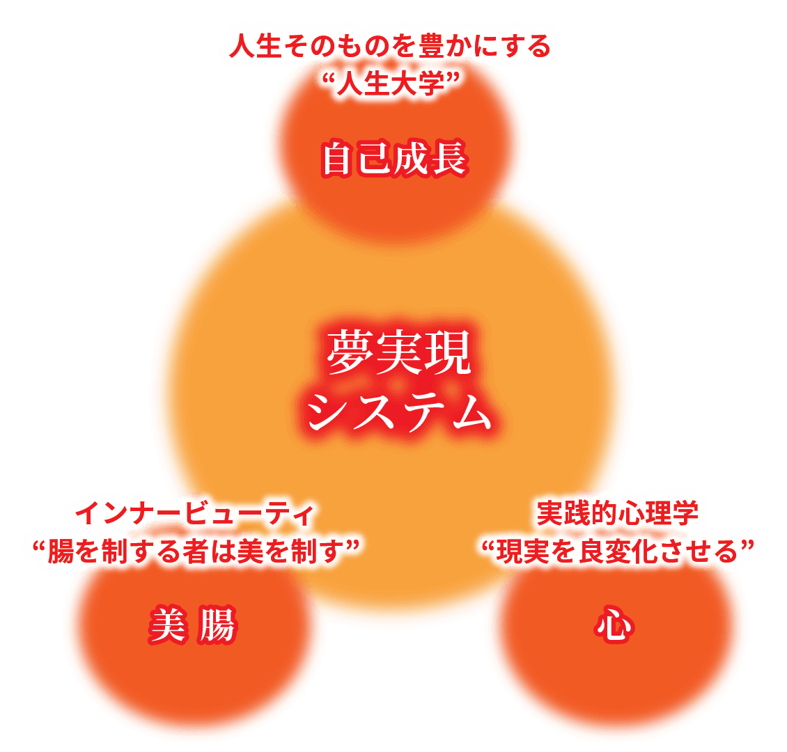 | 自己成長 全ての人がこの世界に生まれてきたのには意味がある。 ①課題をクリアし自己成長するため。 ②使命、役目を果たすため。 ③幸せになるため。 自己成長の先に自己実現、夢実現がある。「人間力」=「経済力」「幸せ力」 「心の成長」=「ビジネスの成功」「人生の成功」「幸せの成功」 自分を活かし日々成長しながらまだ見たことのない世界、まだ感じたことのない風を感じ、自分の可能性を最大限に活かすことができる。 | 美 腸 女性が幸せに生きる為に大切な、美容、健康、マインド、これら全ては、「腸を整える」ことで解決します。 美しさ、健やかさ、幸せは、腸からやってきます。 腸こそが、全ての根源、 インナービューティーを目指すだけで人生までビューティーライフになります。 全ては、美腸から… | 心 学校で学ぶ学問、知識だけでは現実は変わらない。日常をミラクル変換させる「実践的心理学」。心のクソをデトックスし、「本当の自分」に気づくことで、現実が好変化し始める。「本当の自分」の中にある、まだ気づいていない未知の才能、潜在能力が開花することで本当の自分の才能、魅力、使命が発揮され自分史上最高の自分と出会う。夢がスルスル現実化し、なりたい自分、生きたい人生、イキイキ、ウキウキ、ワクワク、キラキラした自由自在な人生ステージを歩めるようになる。 |